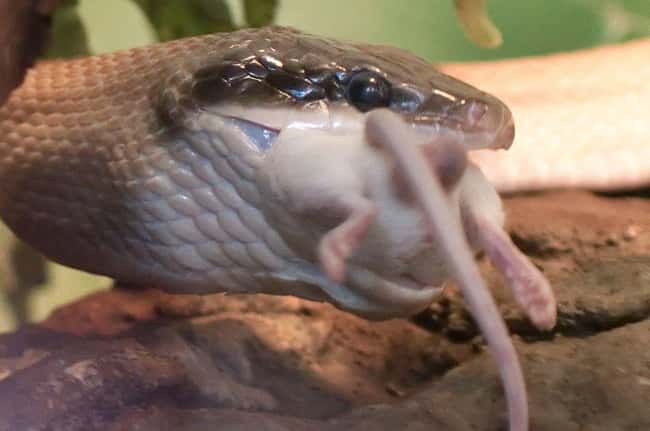 To consume the food, the snake uses its entire mouth to clamp down tightly on its catch. Snakes do not have the proper teeth to chew their food. Instead, their jaws will continue to expand around whatever is in their mouths until it has been completely engulfed.