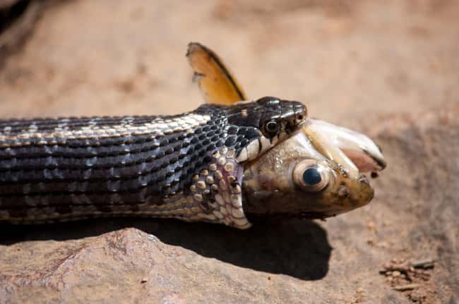 Due to their inability to chew, all snakes must swallow their food whole. Although they do have teeth, snakes only use them for grabbing onto things and, if they're venomous, injecting toxins into the prey. If they happen to grab onto a particularly large meal, they will attempt to regurgitate it, although sometimes this action will lead to death.