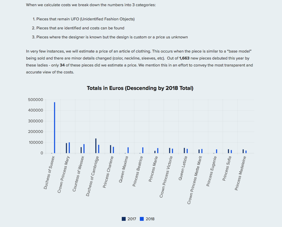 The Duchess of Sussex has taken over the top spot in her first year as a royal. We have calculated her new clothing worth to be a whooping 479,048 Euro ( $509,278 USD) this year. That number is likely higher because only 256 pieces out of her 324 new pieces have prices and thus are included in this amount. One factor that we have tossed back in forth as we have watched this number climb is that included in this number are her Cartier Reflection Wedding Bracelet and Earrings. The idea has been bounced around that they were gifts from Prince Charles, which would see them removed from our tally because we do not include gifts from family members or Government Officials, however because the Palace has not confirmed either way we leave them in. The earrings and bracelet carry a hefty price tag of 206,022 Euro ($233,000 USD) so if they were indeed gifts, her total spending would be 273,026 Euro ($286,278 USD) which still has her in the top spot. Another thing to note is that her wedding ceremony gown is not included, as it was completely custom made for her by Givenchy and thus has no retail price. Her Stella McCartney gown is included as the designer released a near identical design. (Visit Meghan’s Mirror’s post for a further analysis)