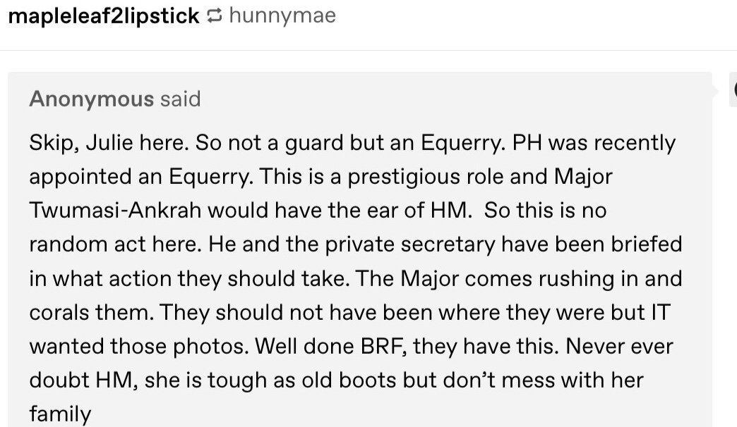 yeap she wanted to crash the PC moment.. nahhhh padan muka. Kalau x silap yg usher her n ph away tu a black equerry. major ni Veteran Afghanistan dan the first black equerry appointed by QE in 2015 klau x silap.