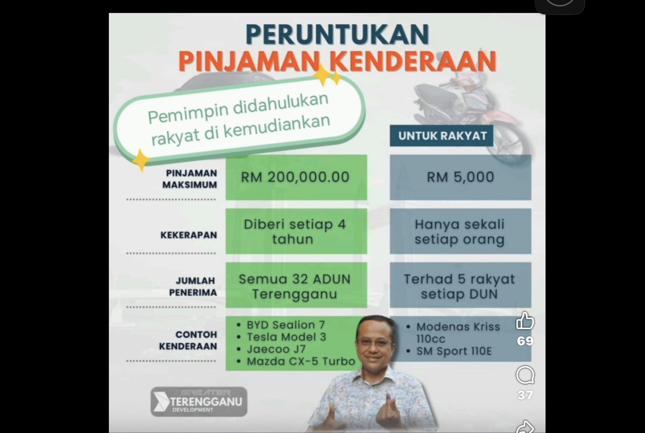 “Majlis Mesyuarat Kerajaan Negeri dengan ini telah bersetuju meluluskan pinjaman kenderaan kepada Menteri Besar, Yang Dipertua Dewan Undangan Negeri, Ahli Majlis Mesyuarat Kerajaan Negeri, Ahli Rasmi Majlis Mesyuarat Kerajaan Negeri dan ADUN sehingga maksima RM200,000 untuk sekali dalam tempoh 4 tahun berkuatkuasa pada 29 Oktober 2025,” menurut notis tular.