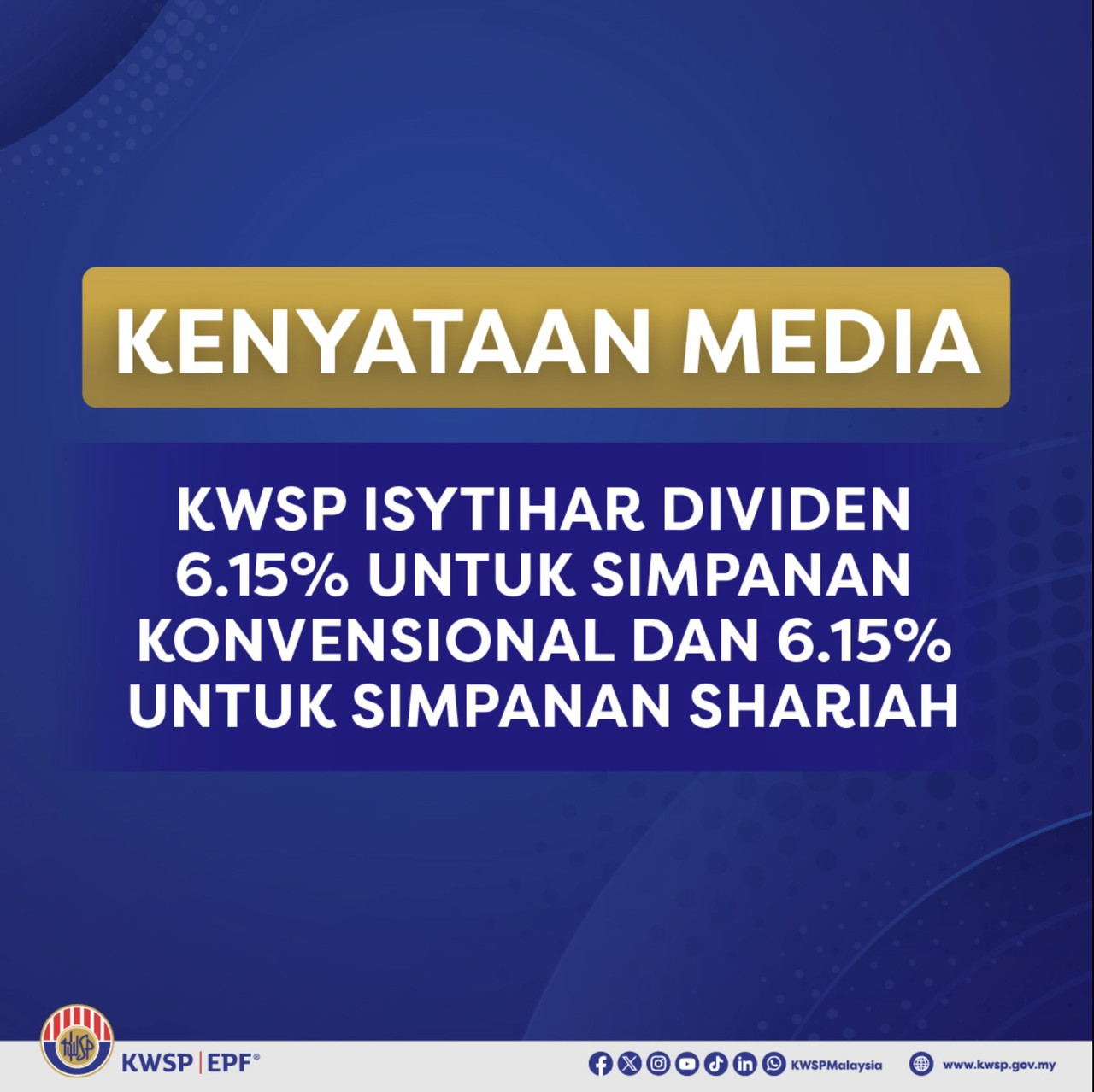 KWSP mengumumkan kadar dividen sebanyak 6.15% bagi Simpanan Konvensional, dengan jumlah agihan sebanyak RM67.1 bilion dan 6.15% bagi Simpanan Shariah, dengan jumlah agihan sebanyak RM12.5 bilion. Ini menjadikan jumlah keseluruhan agihan untuk tahun 2025 sebanyak RM79.6 bilion.