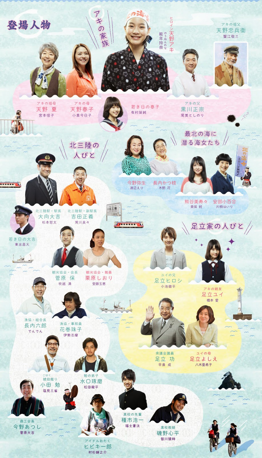 Sodegahama depends on the ama, the women who dive for sea urchins and shellfish, as a tourist attraction. With all the ama over 50, Daikichi was hoping to convince Haruko to start diving. Haruko refuses, but Aki, who was a shy and gloomy girl in Tokyo, suddenly brightens and declares she wants to be an ama. Despite her father's pleas, she decides not to return to Tokyo and instead enroll at the local high school, where she makes friends with Yui, who wants to become an idol. Success as an ama does not come easily: Aki cannot catch a sea urchin on her own. Yui wins a contest to become the symbol character of the Kitasanriku Railroad. When Yui's older brother Hiroshi takes a job at the local tourism bureau and uploads videos of his sister on the town website, train otaku begin flooding the town.