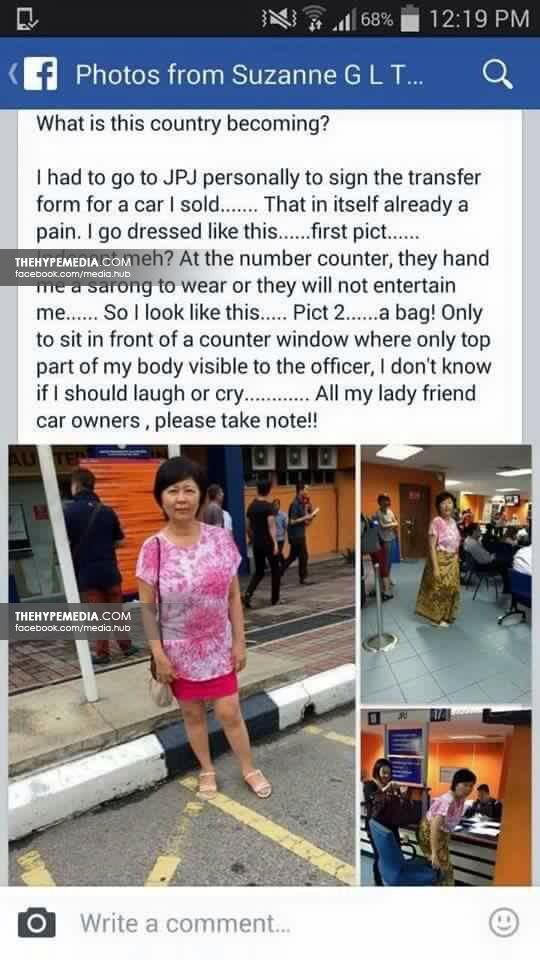 Wanita dakwa diminta pakai kain batik sebelum berurusan di pejabat JPJTiga keping foto yang dimuat naik Suzanne G L Tan di laman Facebooknya hari ini.