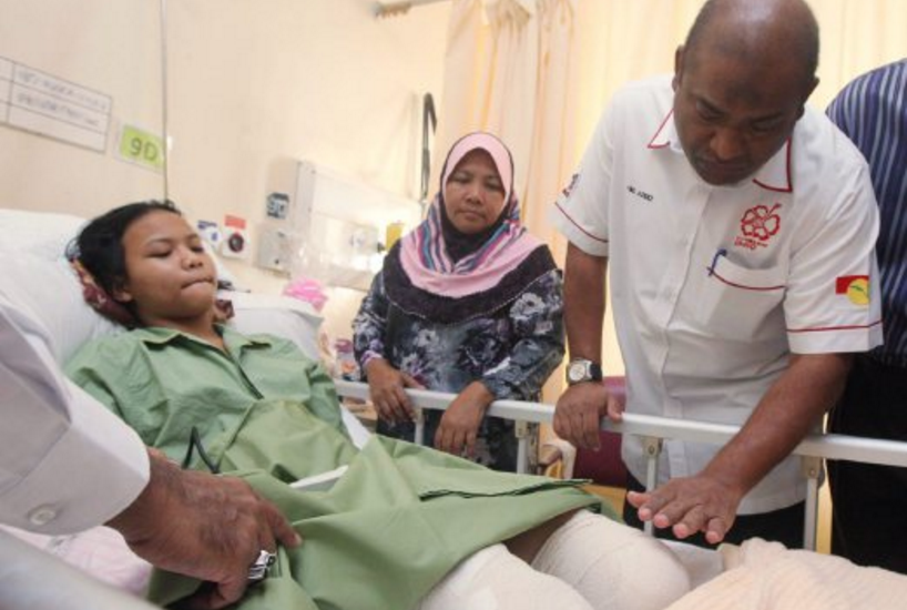 | ABDUL Azeez melawat Siti Nuraisyah Sahrin di HTAR, Klang, hari ini. - Foto BH Online / Intan Nur Elliana Zakari | KLANG, 20 Jan: Pelajar 13 tahun yang putus kaki akibat kemalangan pada Isnin lalu menerima sumbangan peribadi dari Perdana Menteri, Najib Razak.