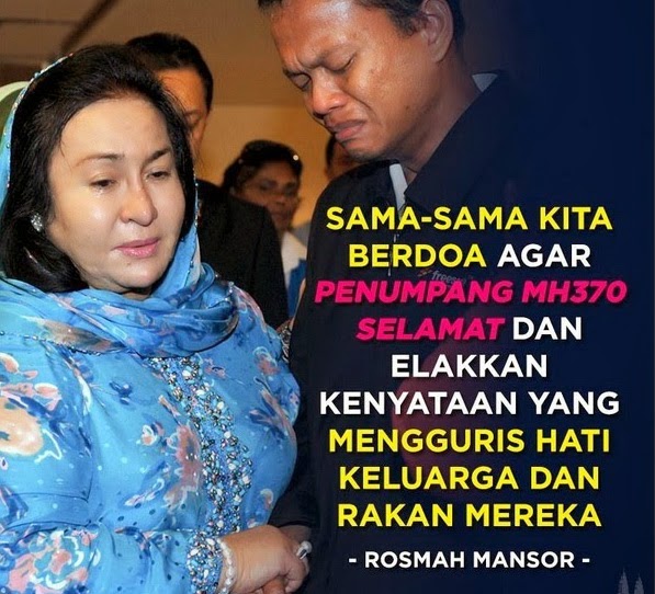 Rosmah: Saya terkejut, lutut menggeletar, badan lemah Isteri perdana menteri Datin Seri Rosmah Mansor berharap masyarakat menghentikan sebarang spekulasi berhubung kehilangan pesawat Malaysia Airlines MH370 demi menjaga hati dan emosi anggota keluarga penumpang dan anak kapal. "Jangan buat spekulasi selagi tak dapat maklumat sahih. Saya harap seluruh dunia dapat memikirkan perasaan kaum keluarga 239 orang yang menaiki pesawat itu," katanya. Katanya sesiapa yang mempunyai maklumat sahih dan kredibel perlu tampil ke depan dalam usaha ke arah mengesan pesawat itu yang hilang sejak 8 Mac lepas. Beliau berkata demikian ketika ditemu bual dalam rancangan Ruang Bicara selama sejam terbitan BernamaTV yang disiarkan secara langsung malam tadi. Ia juga disiarkan secara langsung melalui laman web Bernama. "Jangan seperti anda baling batu dan sembunyi tangan (dalam membuat spekulasi). Itu pengecut namanya, jangan mengata saja, tak bagi solution (jalan penyelesaian)," katanya.