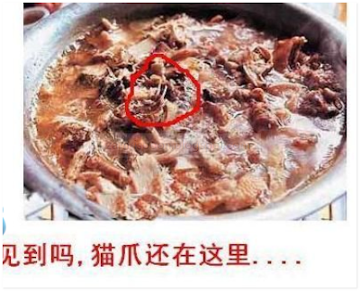 Oleh Fyruz Hanna Dikatakan orang Guangzhou di China minat sangat dengan daging kucing. Boleh dikatakan daging yang dibeli di pasar, semestinya ada daging kucing ini. Kalau dilihat pada beberapa gambar yang diterima, sebilangan orang di China gemar merebus masakan mereka dan tidak terkecuali daging kucing ini. Mereka mereneh untik dibuat sup. Pasti ramai yang telah mengetahui bahawa orang di China meminati daging kucing ini dan di media China juga telah tersebar luas cerita tentang makanan unik ini. . Proses memasak sup kucing itu boleh dilihat dari foto-fotonya. Sebenarnya foto-foto tersebut sudah lama disiarkan dan saya pun sempat mempostingnya beberapa bulan lalu. Tapi saat ini berita dan gambar tentang proses memasak sup kucing dengan cara merebus kucing hidup-hidup sudah semakin tersebar luas di berbagai website di China . Dan bukan tidak mungkin dalam masa yang singkat berita dan foto-foto itu akan menyebar lewat internet ke seluruh dunia. Ada pelbagai teknik yang digunakan untuk memasak daging kucing ini. Ada kucing yang dipukul sehingga mati atau direbus hidup-hidup. Mereka gemar memakan kucing kerana percaya daging kucing ini memberi khasiat kepada badan. Orang China yang percaya bahawa daging kucing ini mampu menyeimbangkan unsur ‘Yin’ dan ‘Yang’ dalam tubuh mereka. Mari kita lihat gamba-gambar di sekitar Ghongzhou dan China. Kenapa agaknya orang di China memakan daging kucing ya? Pasti ramai yang pelik. Ini kerana ketaksuban mereka dengan kesihatan, untuk umur panjang dan keseimbangan sehingga boleh dikatakan apa sahaja yang memberi kebaikan akan ditelan. Sebagai contoh orang di China gemar memakan janin bayi, tikus, anjing, monyet dan sebagainya. Apa kata kita lihat video ini: -CARI Infonet.