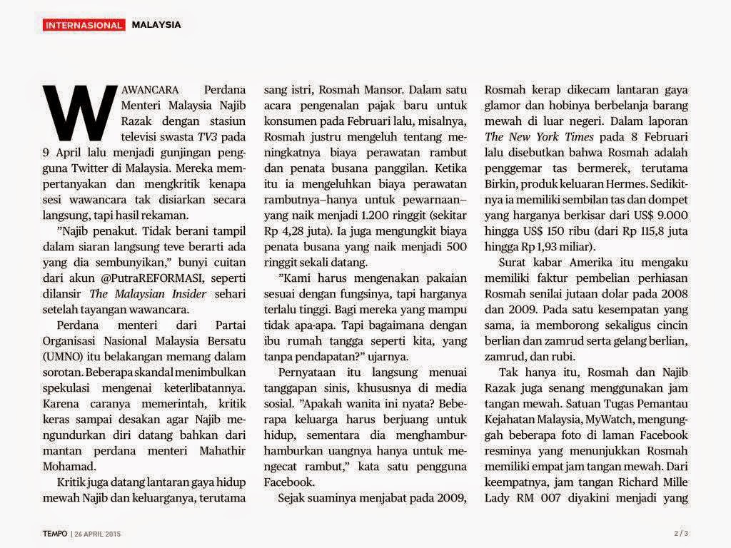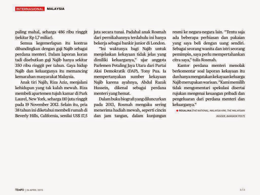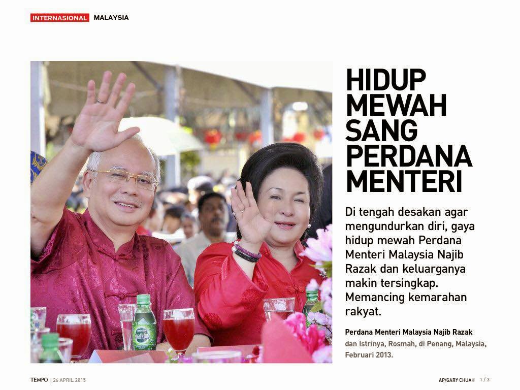 Rencana bertajuk “Hidup mewah sang perdana menteri” itu ditampilkan dalam laporan khas majalah Tempo sempena ulangtahun ke-60 Persidangan Asia Afrika yang akan dihadiri Najib, Khamis. Tempo antara lainnya memetik laporan The New York Times, yang menyebut mengenai minat Rosmah pada beg tangan mewah dan barang kemas. Majalah tersebut turut menggariskan mengenai kegemaran Najib dan Rosmah pada jam tangan mewah, seperti ditunjukkan oleh NGO pemantau jenayah Malaysia, MyWatch. Tempo malah menyebut bahawa Rosmah memiliki sekurang-kurangnya empat jam tangan mewah, sedangkan gaji suaminya hanya sekitar RM350,000 setahun. “Gaya hidup Najib dan keluarganya itu memancing kemarahan masyarakat Malaysia,” laporan itu dipetik. Selain itu, laporan tersebut juga membangkitkan mengenai bayaran RM1,200 untuk dandanan rambut Rosmah. Tidak ketinggalan, isu harta yang diraih anak tiri Najib, Riza Aziz, yang membeli apartmen mewah di New York dan rumah mewah di Beverly Hills.