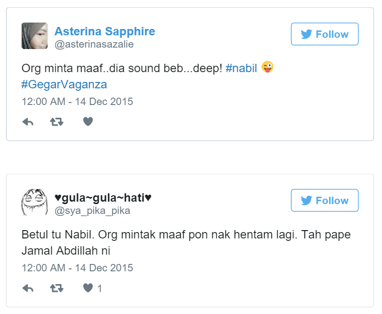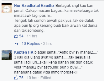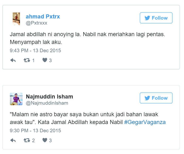 (Sumber foto: Budiey) Namun, melalui episod terakhir semalam, dikatakan sebilangan netizen meluahkan rasa tak puas hati kepada salah seorang juri jemputan iaitu Datuk Jamal Abdillah. Ini kerana dikatakan Jamal tidak boleh menerima lawak yang dibawakan oleh pengacara, Nabil Ahmad. Bukan itu sahaja, ketika Nabil meminta maaf sekiranya ada salah dan silap sepanjang program, Jamal dikatakan 'menghentam' semula Nabil agar lebih beradab. Disebabkan itu, dapat dilihat beberapa status yang mengkritik penyanyi bersuara emas itu. Apa kata anda? - CARI Infonet