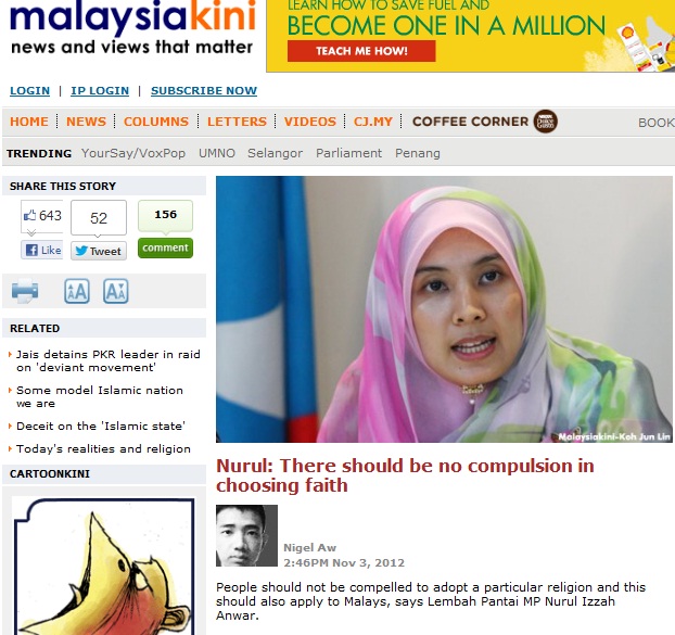 ![]() ![]() Ahmad Fadli KC 6:45PM Nov 6 2012 Naib Presiden PKR, Nurul Izzah Anwar akan mengambil tindakan undang-undang terhadap Utusan Malaysia dan Berita Harianberhubung isu kebebasan beragama. Katanya, beliau telah mengarahkan peguamnya mengambil tindakan terhadap akhbar-akhbar tersebut dan kemungkinan beberapa blog yang didakwa memutar belit kenyataannya berhubung isu tersebut. Menurutnya, peguam Hanipa Maidin dan Sulaiman Abdullah akan mewakili beliau dalam hal itu. "Saya tidak rela fitnah akidah begini diteruskan dan tidak teragak-agak untuk mengambil tindakan undang-undang demi menegakkan kebenaran dan keadilan," kata Izzah dalam satu kenyataan hari ini. Izzah sebelum ini, dalam satu forum, dilapor sebagai berkata bahawa tiada paksaan wajar dikenakan dalam beragama. Kenyataan itu menyebabkan beberapa harian berbahasa Melayu melaporkan beliau menyokong amalan murtad di kalangan orang Islam. Susulan kenyataan itu, pengarah Jabatan Agama Islam Selangor (JAIS), Marzuki Husin dilapor bercadang mengambil tindakan terhadap Nurul Izzah jika ada maklumat cukup tentang perkara itu. Izzah dalam kenyataan balasnya menggesa JAIS turut sama menyiasat Utusan Malaysia jika JAIS bercadang menyiasatnya. Ketua pembangkang, Datuk Seri Anwar Ibrahim dalam ulasannya menyifatkan kesungguhan JAIS menyiasat Nurul Izzah sebagai bersifat politik. Menurut Anwar, ia juga menggambarkan "tahap ketaksuban beragama" daripada serangan yang diterima Nurul Izzah akibat laporan berita terhadap kenyataan anaknya itu.